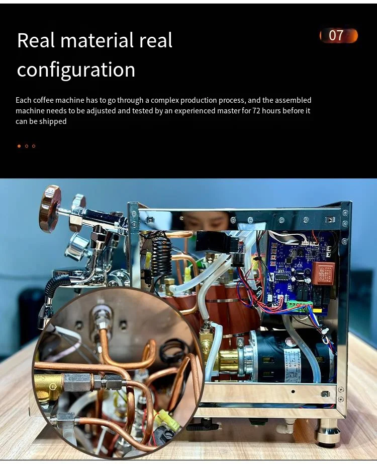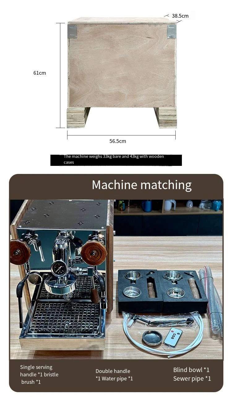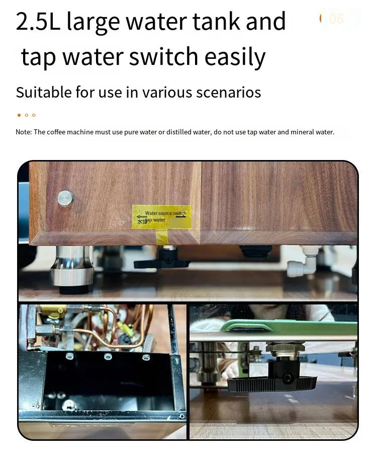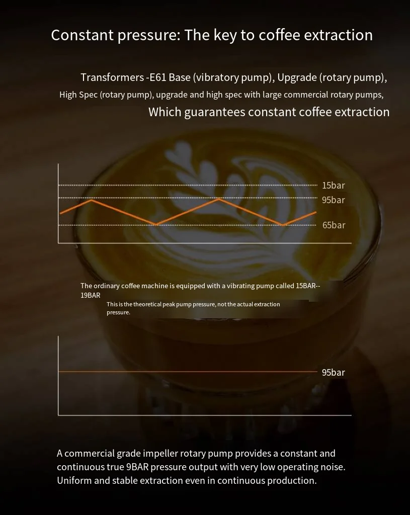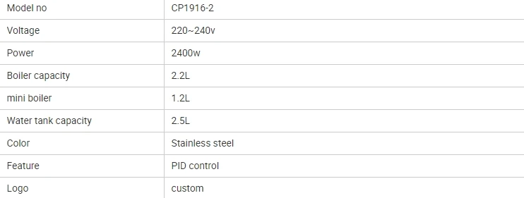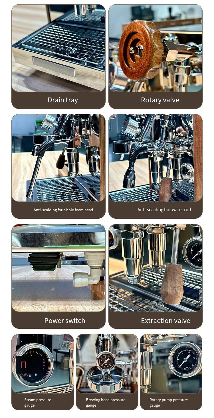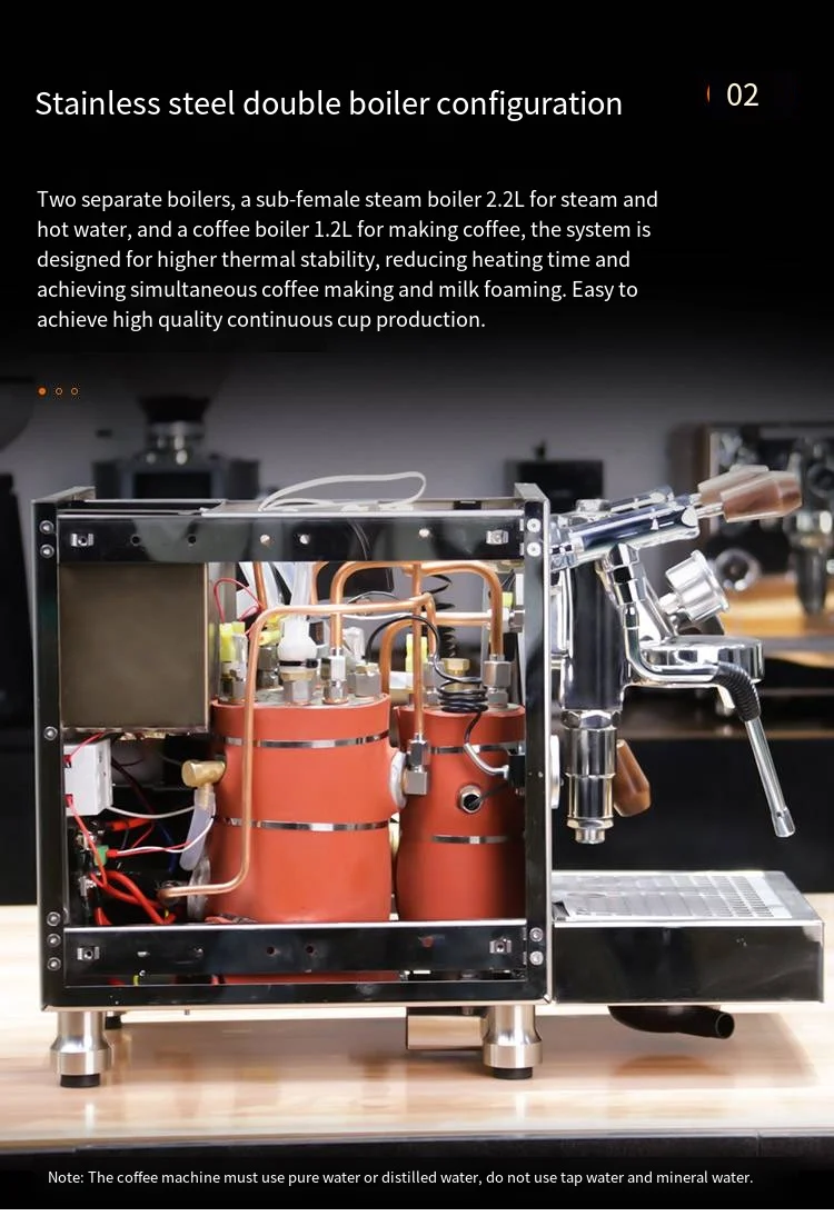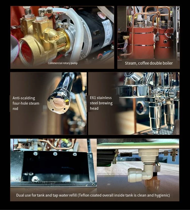 1. 水タンク付き 2. 水量不足時に自動的に電源を遮断 3. ダブル圧力計:スチーム圧力計およびコーヒー抽出用圧力計 4. コーヒーカウンター機能 5. 4穴式スチームヘッド 6. コーヒー抽出・スチーム・ホットウォーターを同時に行える 7. ダブルPID温度制御システム 8. 水タンク給水方式と自動給水方式の自動切替機能 9. コーヒー抽出優先モード 10. ステンレス鋼製・業務用ロータリーポンプ・ダブルボイラー・E61ブリューシステム(プレブリュー機能付き)・2.2Lボイラー/1.2Lボイラー/2.5L水タンク・定格消費電力:2400W・水タンク給水方式と自動給水方式の自動切替機能・PID制御