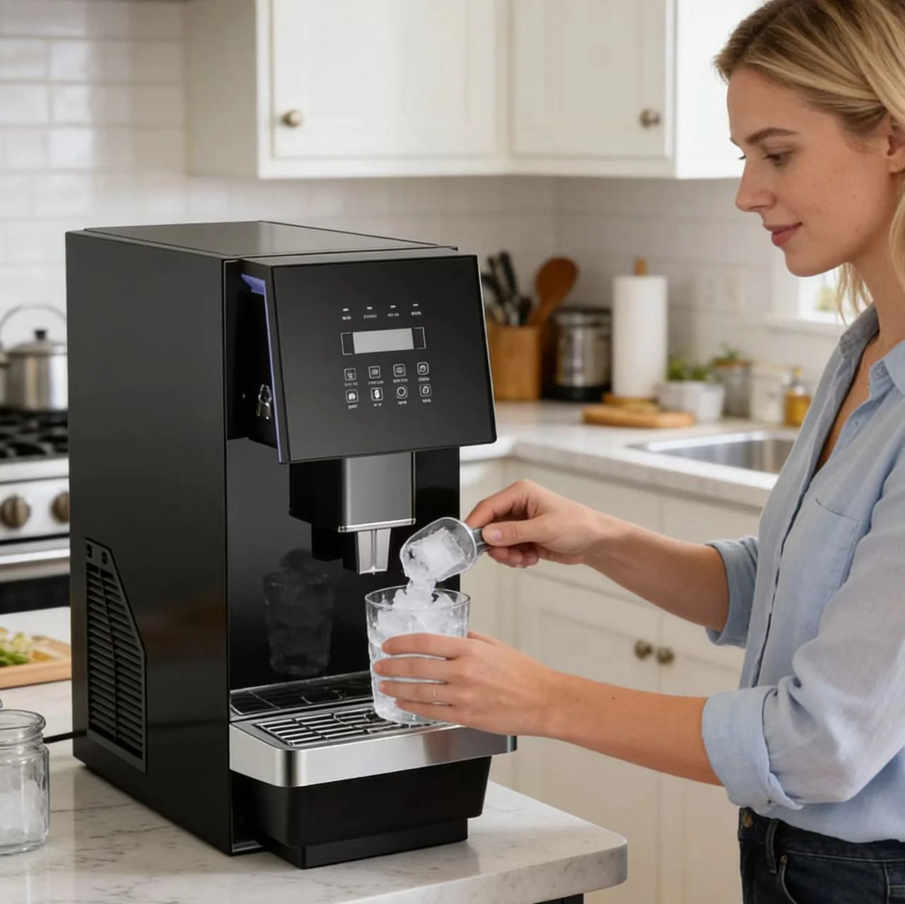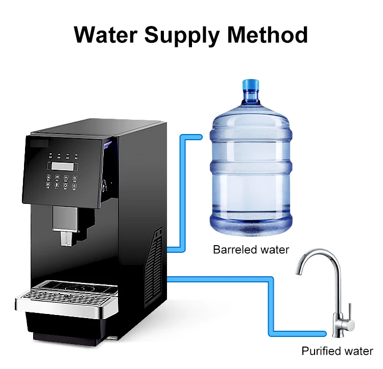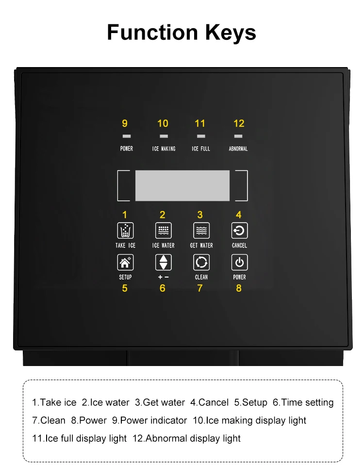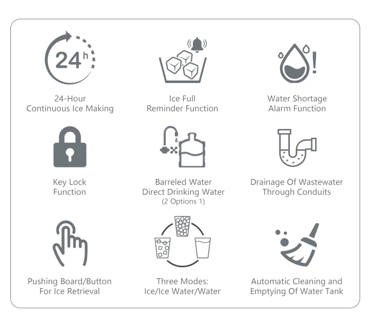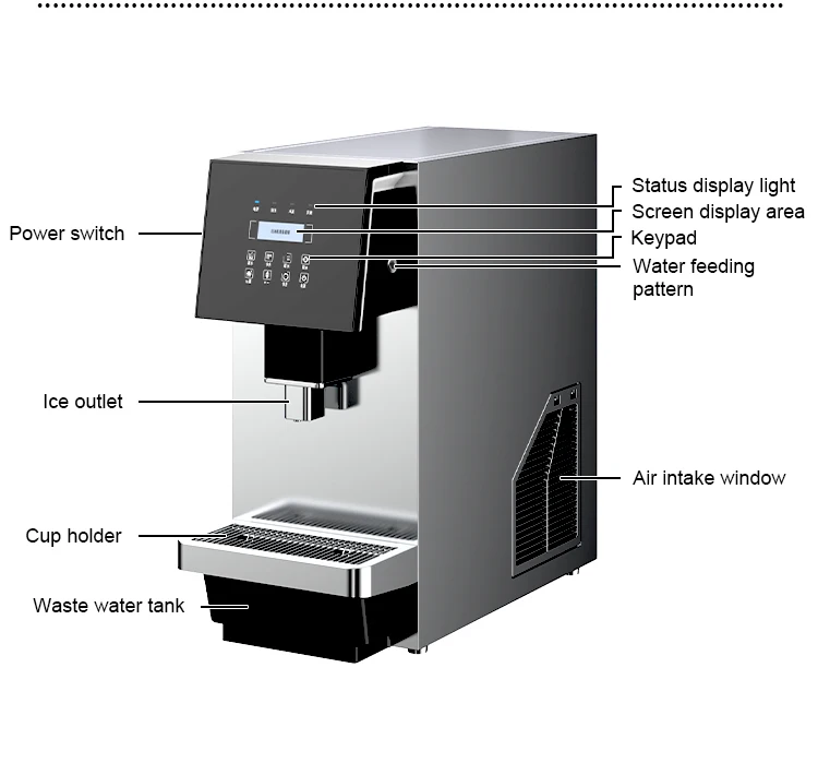 Tytuł umieszczony tutaj. Wprowadzenie funkcji: 1. Funkcja ciągłej produkcji lodu. 2. Funkcja wydawania lodu, wody oraz wody z lodem. 3. Funkcja czyszczenia i opróżniania zbiornika wody. 4. Zabezpieczenie blokady dotykowej. 5. Alarm awaryjny przy braku wody...