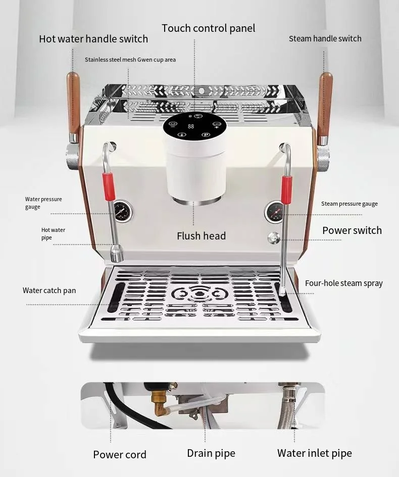 Specification:Product Introduction Touch button/four boilers T3 system/PID temperature control/US imported water pump (Pracon pull rod steam switch/precision ceramic seal/precision flow self-learning function pre-soaking time free setting/saturated b...